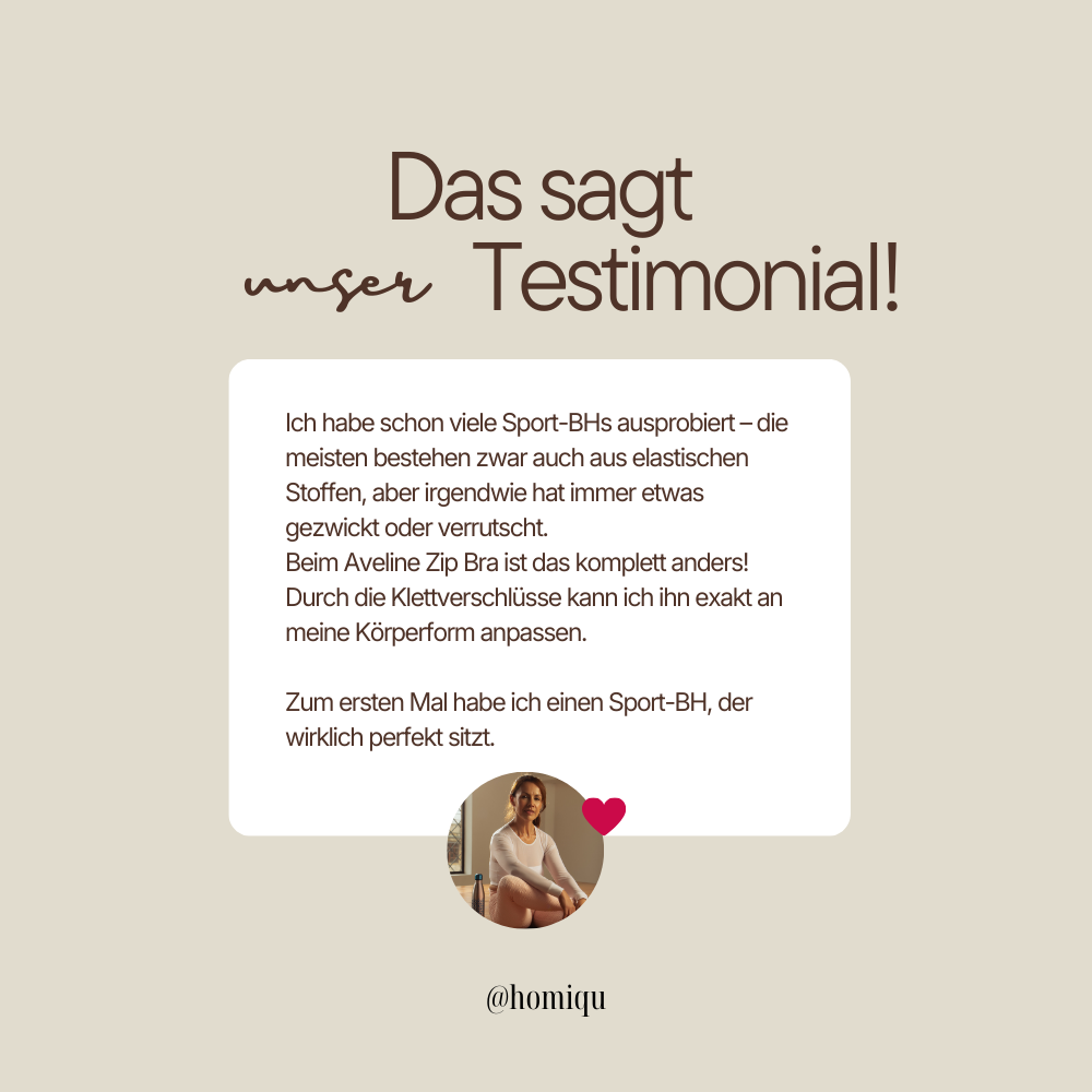 „Ich trage den Aveline Zip Bra nach einer Brust-OP und bin so froh, ihn gefunden zu haben. Der Reißverschluss vorne macht das Anziehen super leicht und der Halt ist trotzdem top. Absolut empfehlenswert!“ – Jasmin L.