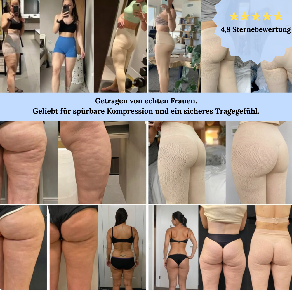Doch sobald du dich bewegst, sitzt oder gehst, zeigt sich, was wirklich fehlt: Halt, Struktur und Unterstützung dort, wo Cellulite sichtbar wird. Der Stoff wird dünn, die Oberfläche wirkt unruhig – und das sichere Gefühl verschwindet.